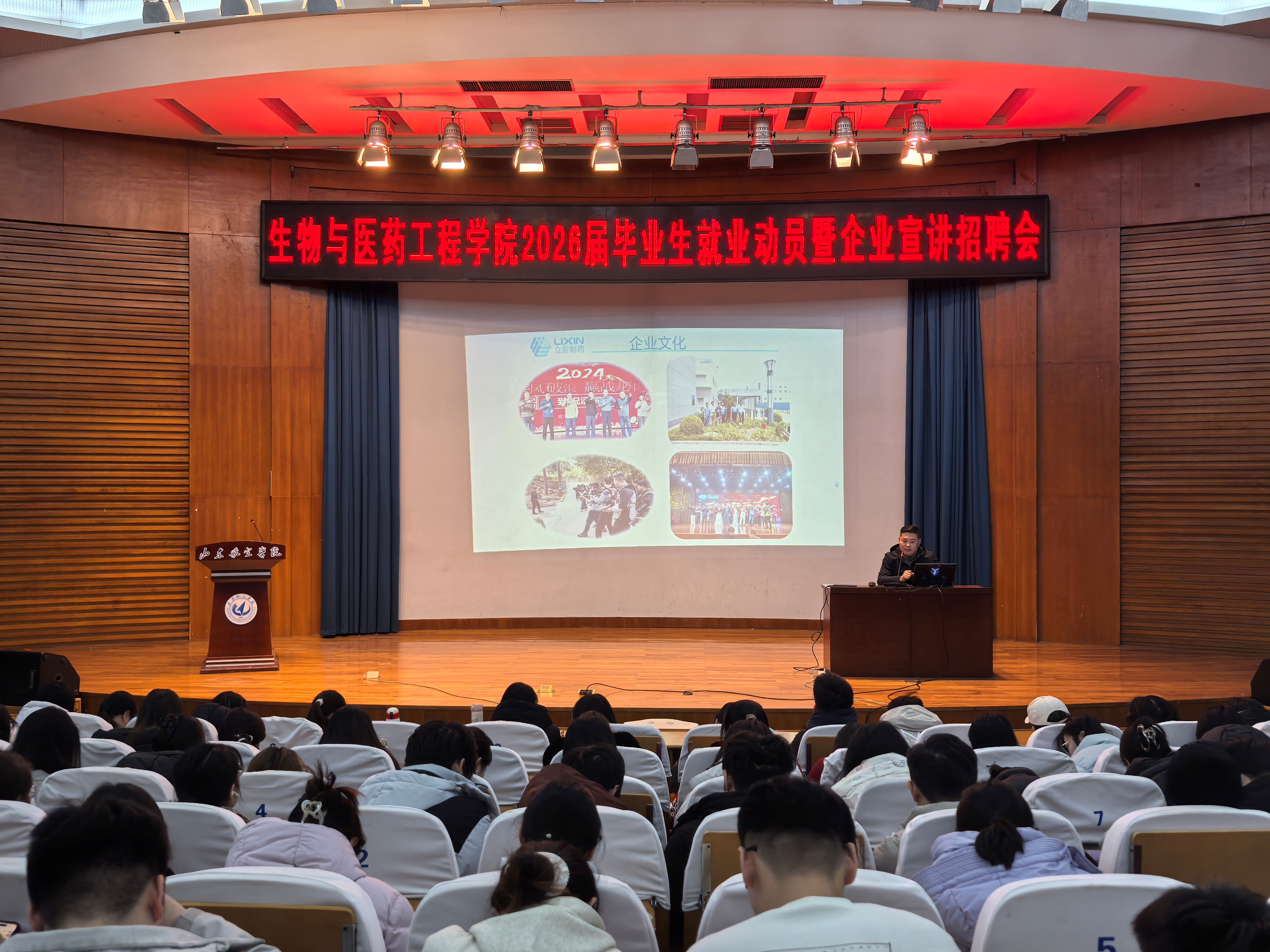 12月22日,生物与医药工程学院于明德报告厅成功举办2026届毕业生就业动员暨企业宣讲招聘会。滨州市低空经济产业学会、山东立新制药有限公司、鲁南制药集团、山东滨州健源食品有限公司等应邀入校,为毕业生提供“面对面”就业指导,提供“一对一”就业平台。学院相关工作负责科室及教师到场参会。