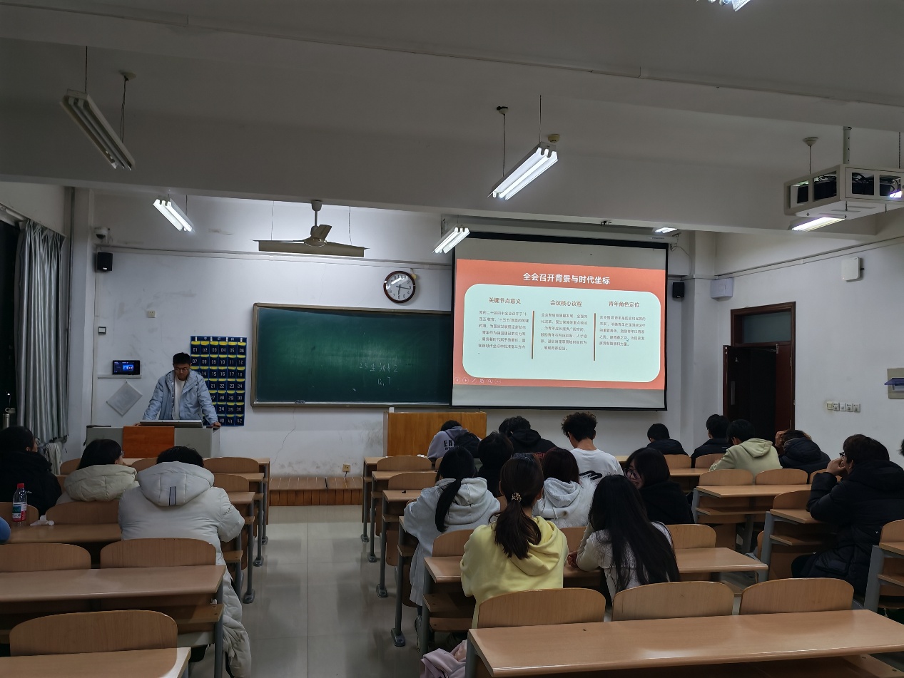 活动伊始,团支书围绕全会核心要义展开深入解读,重点阐述全会召开的时代意义与战略价值,明确全会审议通过的规划建议是接续推进中国式现代化的纲领性文件,其中关于教育强国、科技强国、人才强国建设的部署,与青年成长成才紧密相连。通过鲜活案例讲解与关键要点梳理,团员们清晰把握全会提出的高质量发展、科技自立自强等关键任务,深刻认识到青年在国家发展大局中肩负的重要使命。随后,在学习交流环节,团员们结合自身学习生活踊跃分享感悟,一致认为作为新时代青年,要锚定思想领航,筑牢理想根基,将个人理想深度融入国家发展蓝图。大家纷纷表示,今后将以全会精神为指引,聚焦专业学习,锤炼过硬本领,主动参与校园实践与志愿服务,在勤学善思中不断提升自我,在担当作为中切实践行初心,以实际行动积极响应“奋进‘十五五’、青春挺膺担当”的号召。