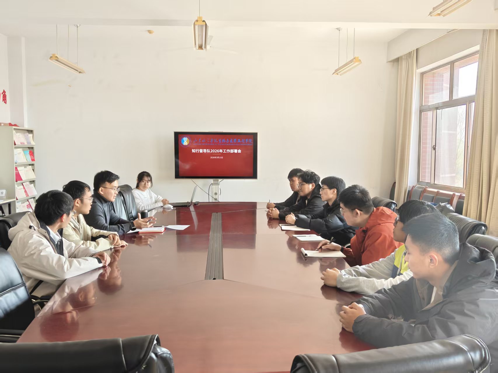 为进一步巩固“五级网格育人”组织建设成效,部署新学期学生自治组织的工作方向,3月15日,生物与医药工程学院在实验楼B7-304召开2026年知行督导队工作部署会。受学院团总支指示,此次会议由辅导员陈新宇主持,学生会主席团分管成员,知行督导队全体队员参会。