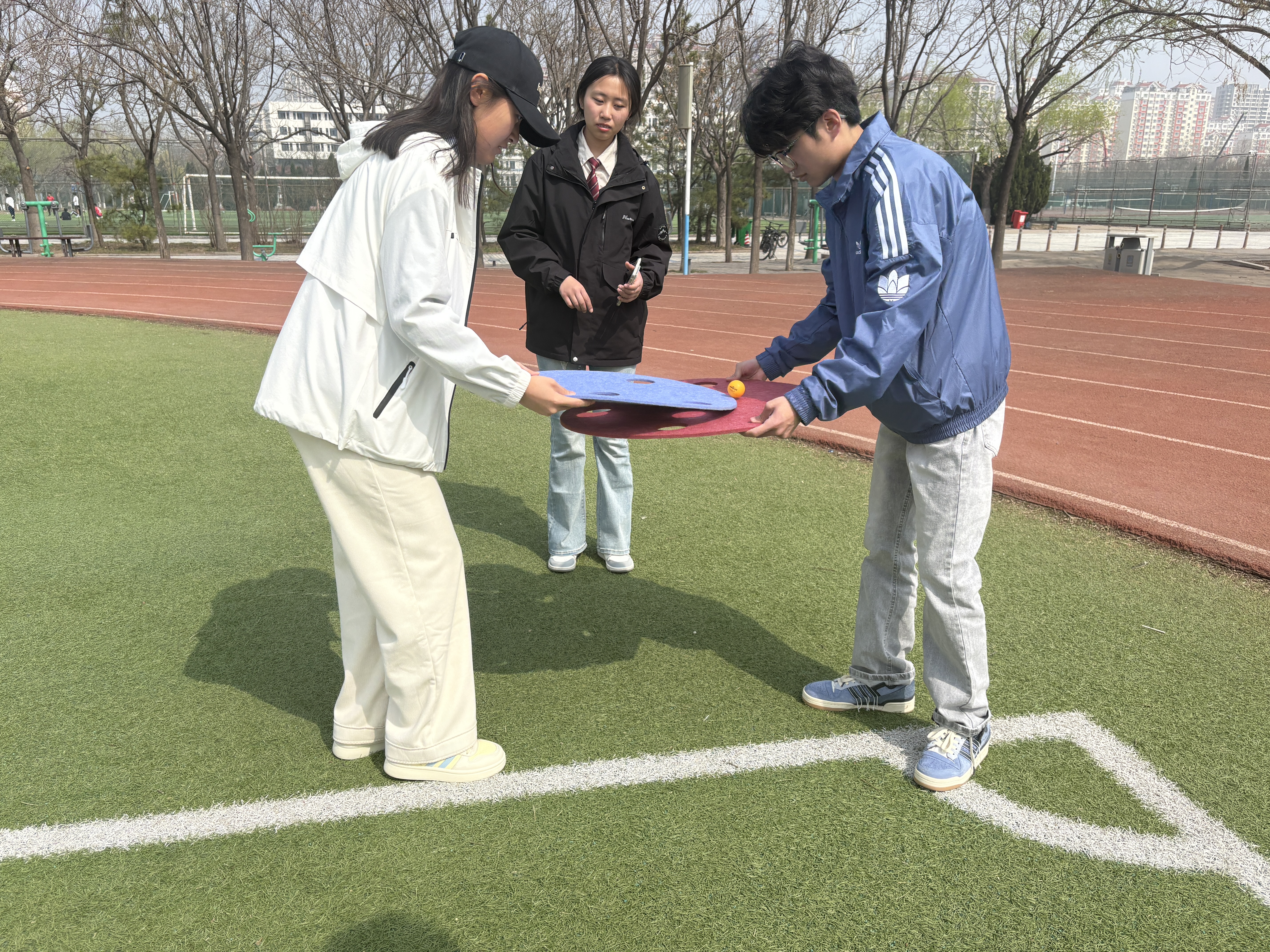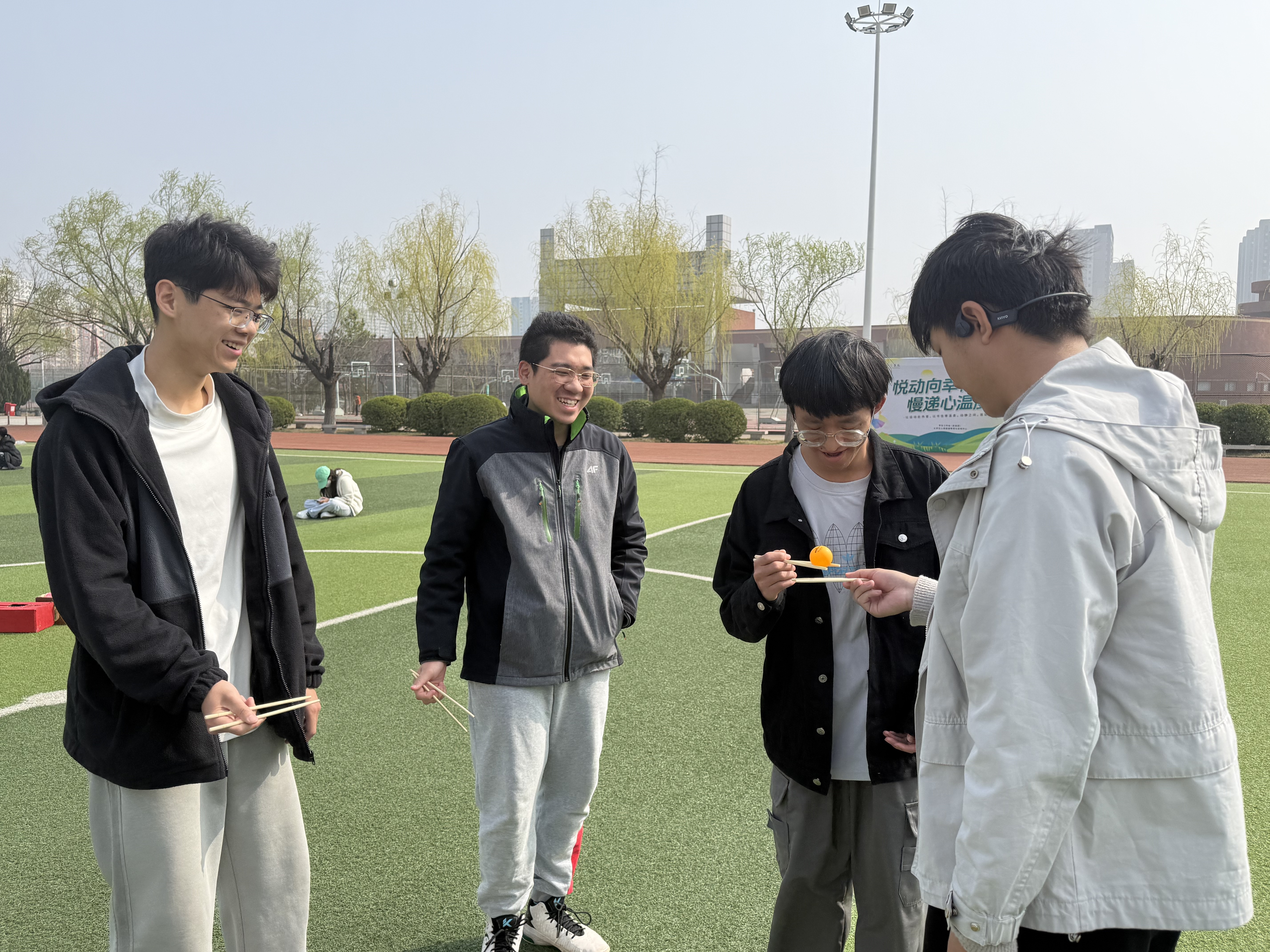 活动在春日暖阳中拉开序幕,主要设置了“四时拼图赛”“四季接力运春球”“心球接力”等三项趣味竞赛。各小组分工协作、激烈比拼。“四时拼图赛”中,同学们在限定时间内完成二十四节气排序,既深化了对中华传统节气文化的理解,又提升了团队协作与快速反应能力;“四季接力运春球”环节,组员们通过筷夹球接力往返,锻炼专注力与默契配合;“心球接力”中,全体成员携手托举、平稳传递,在平衡协作中强化团结精神。活动全程气氛热烈,掌声与欢笑声不断。