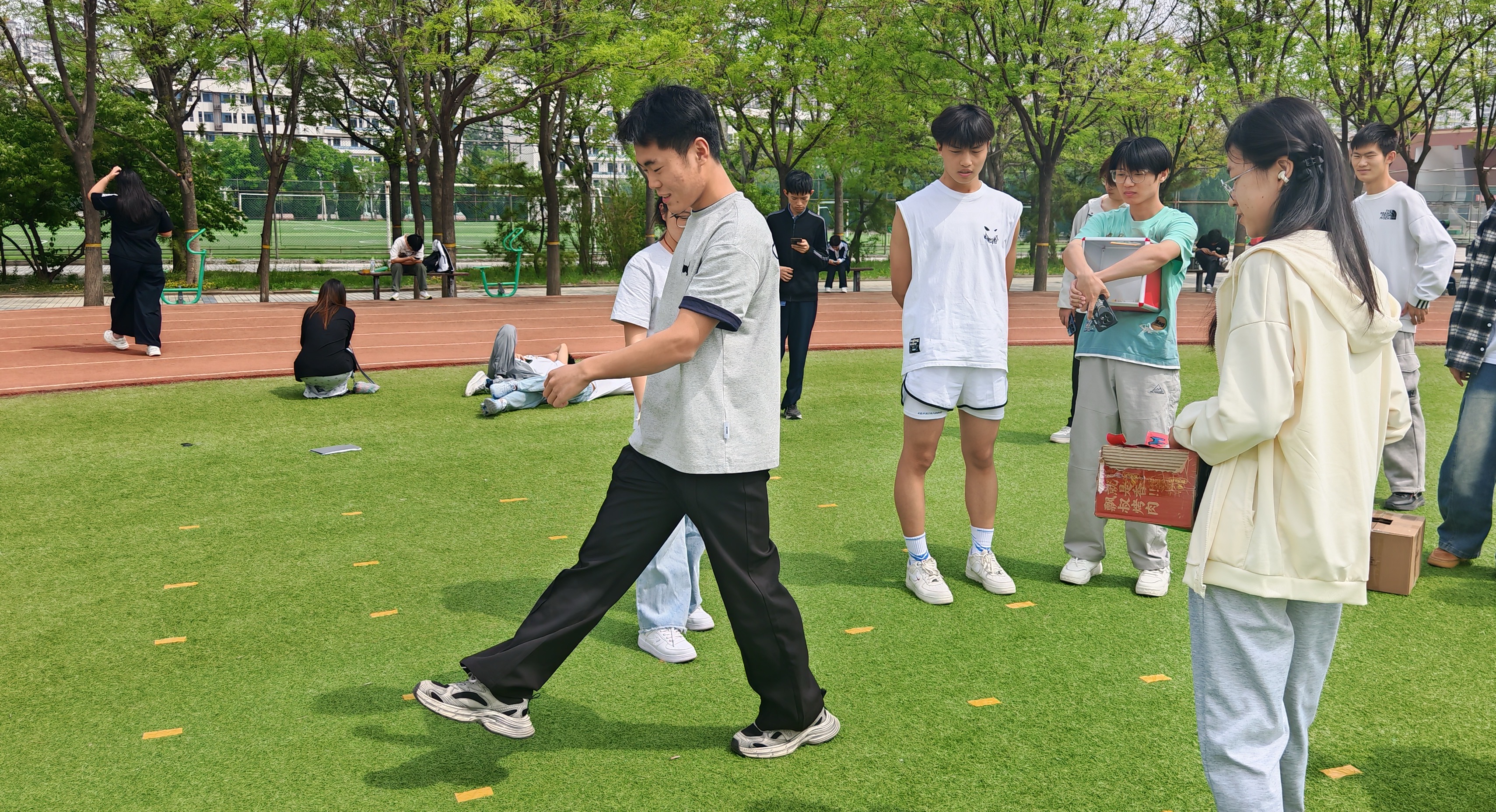 活动现场搭建实景互动棋盘,深度融合交通安全真实场景,精准设置安全答题区、奖惩专区及功能关卡,实现趣味游戏与安全教育的无缝衔接,让同学们在沉浸式体验中深化安全认知。在现场裁判的统一指挥下,各小组轮流投掷骰子、协同前行,从容应对棋盘上的各类安全挑战:交通安全知识答题关卡中,大家通力协作、踊跃作答,扎实巩固安全理论基础;奖惩关卡里,各组积极完成各类交通工具的主题任务,在交警不同手势的进退之间深化对安全规则的理解;互动实操关卡中,同学们现场学习安全技能,沉浸式体验道路维修、交通堵塞、紧急灭火等各类常见随机事件的挑战。各小组分工协作、默契配合,全程文明参与、有序比拼,现场气氛热烈欢快。
